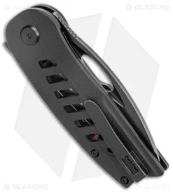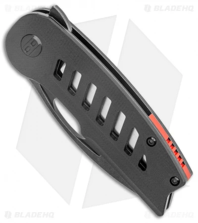 - Black textured G-10 skeletonized scales with a steel liner and lock.