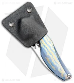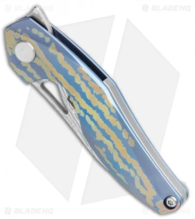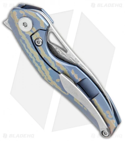 This Reticulan model is built with a blue and gold stripe anodized titanium handle and a Damascus blade. The blade offers impressive opening action with the aid of a flipper. A deep finger choil and a contoured handle provide secure, blade control, despite the small stature. Add a mini compact flipper to your rotation with the Bestech Reticulan.