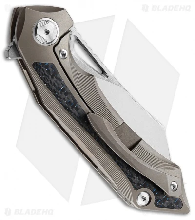 This Kasta model has a bronze titanium handle with blue carbon fiber inlay and a satin finished blade.