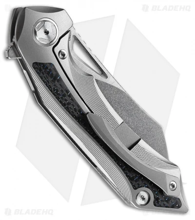This Kasta model has a gray titanium handle with blue carbon fiber inlay and a satin finished blade.