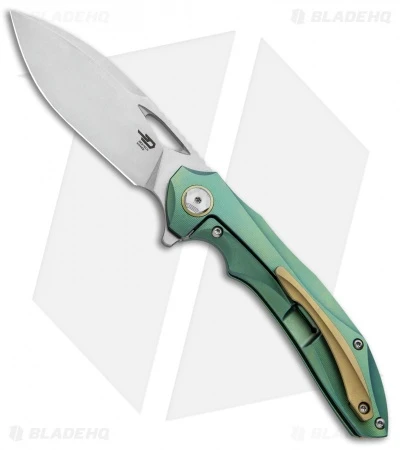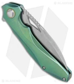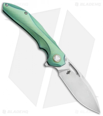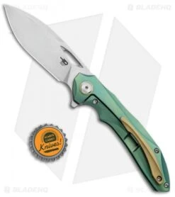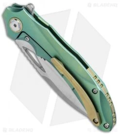 This model of the Bestech ESKRA comes in a left handed configuration with a green titanium handle with a gold back spacer, pivot collar, and pocket clip. The blade sports a stonewash finish and is made from Bohler M390.