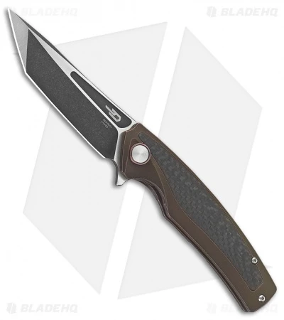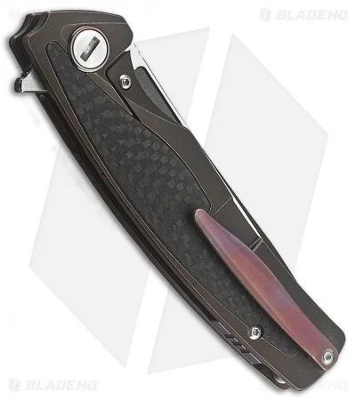 This Predator model sports a bronze titanium handle with carbon fiber inlays and a tanto blade with a black and satin finish and a plain edge. The pocket clip and pivot collar are red anodized.