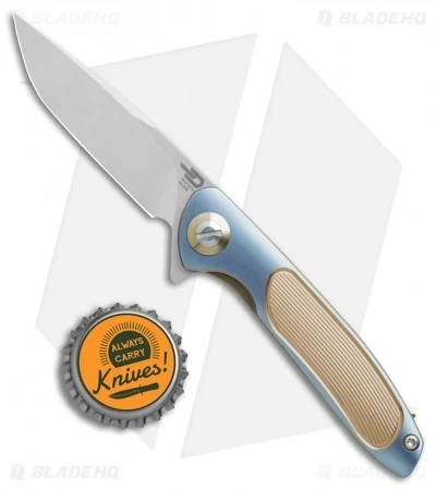 The Sapphire flipper knife has a blue/gold anodized titanium handle and a gray ceramic coated blade.