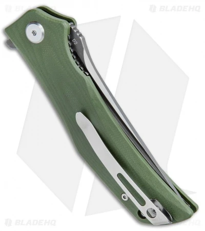 This Scimitar model is outfitted with a green G-10 handle and a two-tone scimitar blade with satin finished grinds and gray titanized flats.