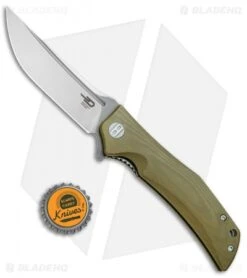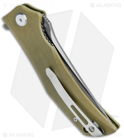 This Scimitar model is outfitted with an OD Green G-10 handle and a two-tone scimitar blade with satin finished grinds and gray titanized flats.