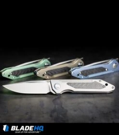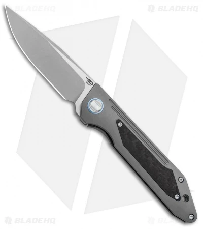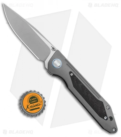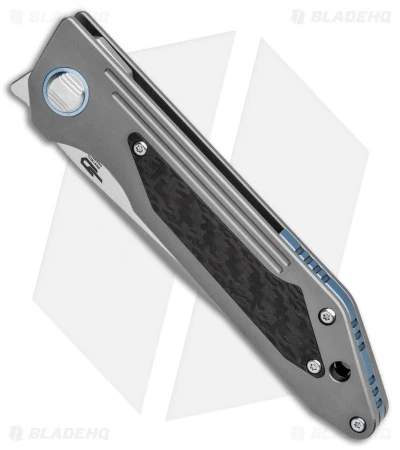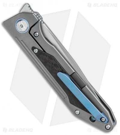 This model of the Bestech Shinkansen features a gray titanium handle with carbon fiber inlays. It is accented by a blue backspacer, pivot collar, and pocket clip.