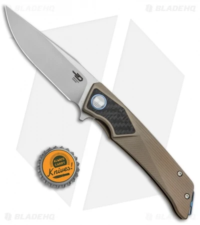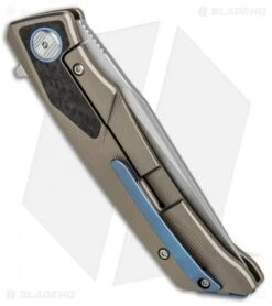 This model of the Bestech Sky Hawk features a bronze anodized handle with carbon fiber inserts. It has a blue anodized pocket clip, back spacer, and pivot collar.
