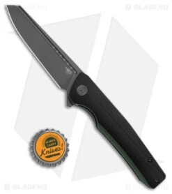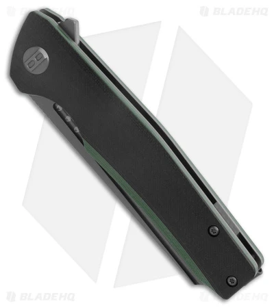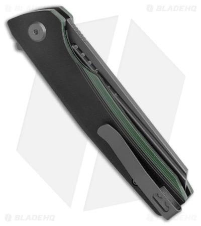 - Black and green G-10 handle scales on steel liners.