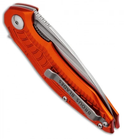 The Bionic Flipper is a small, lightweight everyday carry knife from Jason Brous. It has a stonewash finished hollow ground D2 steel blade with a flipper. Action on the Bionic folder is solid and smooth with Brous Blades proprietary ball bearing pivot system. The handle is orange anodized aluminum with a steel liner lock frame. With it’s compact size, high utility and great looks, it’s no surprise the Bionic is the EDC of choice for Jason Brous.