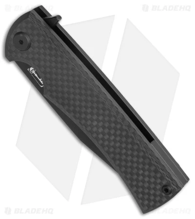 This Blade HQ Exclusive Sangre Street model has a blackout titanium frame with a carbon fiber scale. The Wharncliffe blade is black-finished M390 steel.