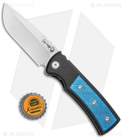 This Blade HQ Exclusive Redencion Street model has a black PVD finished titanium handle with a crosshatch patterned blue titanium inlay. The drop point blade is made from S35VN steel with a machine satin finish.
