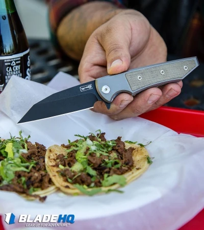 This Sangre Street model has a gray titanium handle with a green canvas micarta inlay. Its blade is made from S35VN steel with a lightly tumbled black finish.