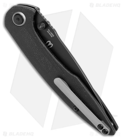- Black micarta handle scales with a blasted titanium pivot collar.