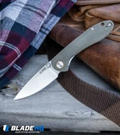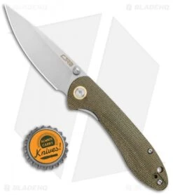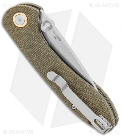 This Blade HQ Exclusive Feldspar model has a 3″ blade and a green micarta handle with nested liners and brass accents.